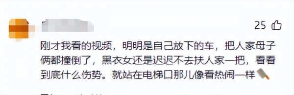 网友说:刚才我看的视频,明明是自己放下的车,把人家母子俩都撞倒了,黑衣女还是迟迟不去扶人家一把,看看到底什么伤势。就站在电梯口那儿像看热闹一样