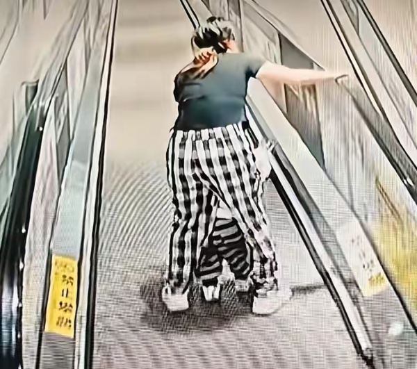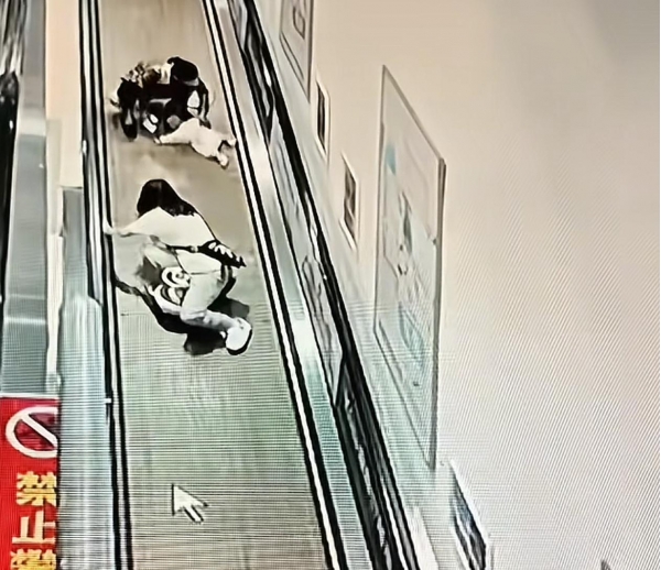 这么一撞,加上扶梯还在往下走,冲击力特别大,宝妈一下就站不稳,整个人往后一仰就倒了。