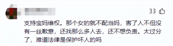 网友说:支持宝妈维权。那个女的就不配当妈,害了人不但没有一丝歉意,还找那么多人去,还不想负责。太过分了,难道法律是保护坏人的吗