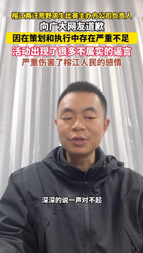 12月8日, "榕江发布"微信视频号发布了榕江两汪荒野求生比赛主办方公司负责人李忠建及榕江两汪荒野求生1号选手"野乘风"的道歉声明。