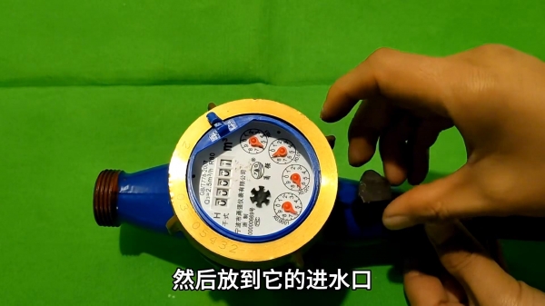·把磁铁放到水表的底部,底部这样放,底部放上之后现在也给它模拟进水,磁铁在它的底部,水表还是会转动,不受任何的影响,水表照转不误。