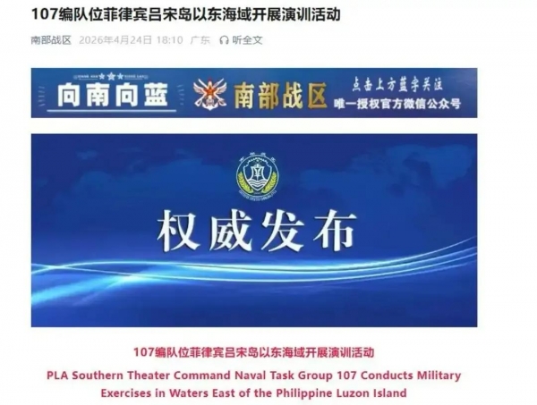到了4月24号,我国南部战区正式发布消息,107编队已经抵达吕宋岛以东海域,正式开展相关演训活动。这支107编队以055万吨大驱遵义舰作为领头舰船,搭配052D驱逐舰合肥舰、咸宁舰,以及骆马湖号补给舰组成,4艘战舰直接挺进吕宋岛北部海域,和菲律宾的距离还不到200公里。