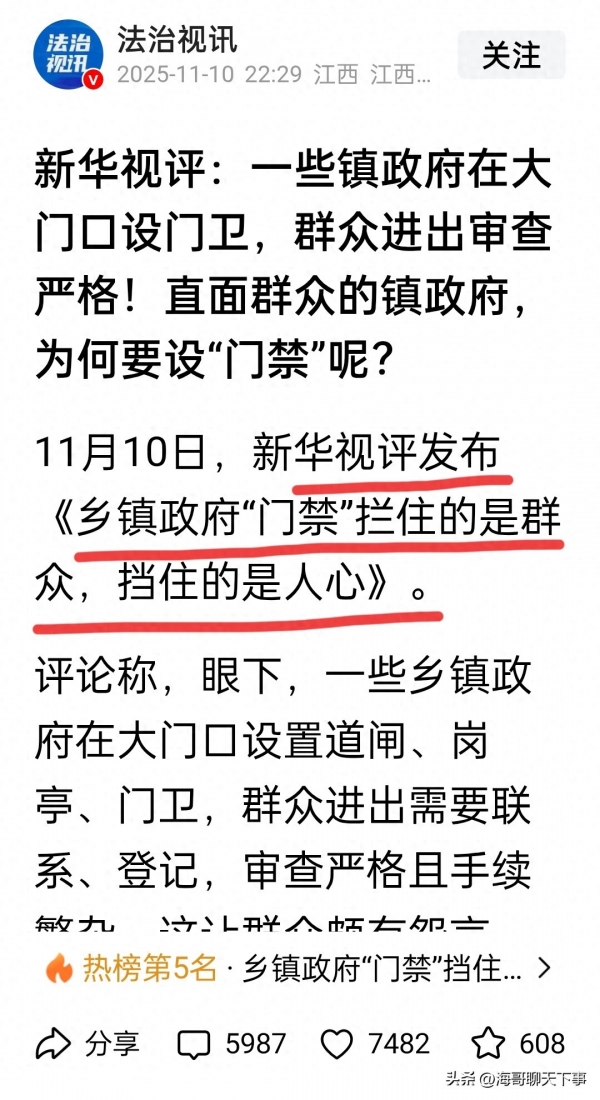 新华视评的追问,戳中了无数人的心声。半月谈记者暗访发现,东部某市一镇政府的"人员进出须知"明确规定,外来人员需持介绍信、身份证等登记,经同意方可进入,双休日非工作人员一律禁入 。记者想找镇领导沟通,不仅被门卫拒绝,联系办公室、信访接待中心也吃了"闭门羹",长三角部分乡镇更是直接表态"群众没事不能进"。