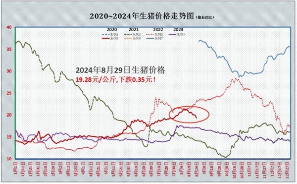 时光飞逝,8月渐入尾声,从市场反馈了解,受供需博弈,屠企调价收猪,2024年8月29日,全国瘦肉型外三元生猪价格,出栏平均价在19.28元/公斤,猪价环比昨日下降0.35元,相比8月16日21.19元/公斤,本月猪价高点回落,累计下跌1.91元,猪价大跌9.01%。按照生猪出栏均重123.8公斤测算,前后出栏,养殖户少卖236.5块钱,养殖利润显著回落,猪价呈现超预期下跌的走势!