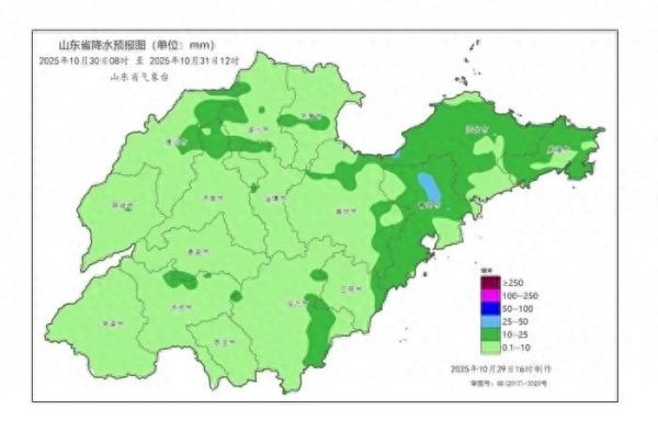 受高空槽影响,预计10月30日白天到31日上午,我省自北向南有一次较明显降雨天气过程,降雨集中时段在30日夜间,全省累积平均降水量5~10毫米,其中,烟台、威海、青岛、潍坊、临沂和日照有小到中雨局部大雨(6~17毫米,局部25~35毫米),其他地区有小雨局部中雨(2~6毫米,局部10~20毫米)。