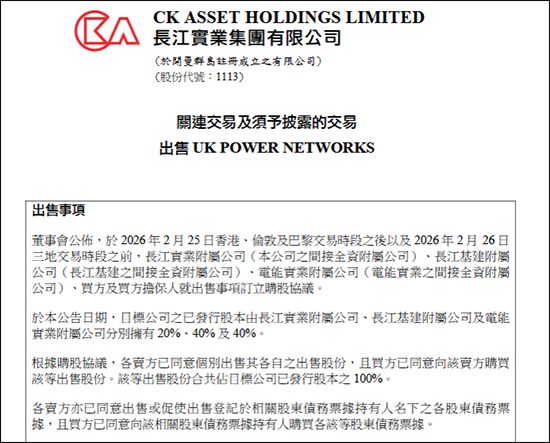 港交所网站消息,2月26日,长江实业集团有限公司发布公告称:长实附属公司、电能实业附属公司等已与买方英国安集集团(Engie UK)及其担保人订立购股协议,决定悉数出售其持有的英国电网(UK Power Networks)全部股权。