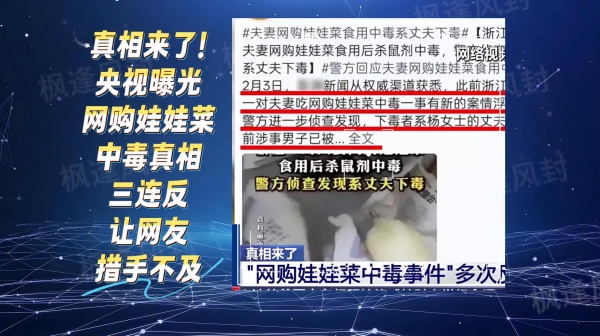 就在舆论围绕丈夫投毒争论不休时,2月3号浙江天台县公安局发布通报,这起案件并非家庭投毒案。针对近期网络关注的"夫妻网购娃娃菜中毒事件,天台县公安局专案组开展了溯源调查。勘查、检验、鉴定、调查走访等工作。