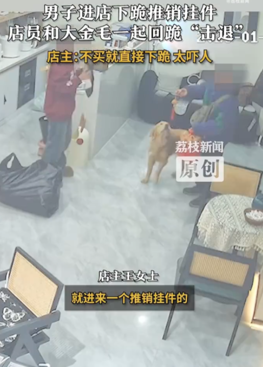 河南驻马店一家店铺里,一名男子上门推销挂件,被店员拒绝后竟直接双膝跪地,逼得店员只好也跟着跪下,连店里的大金毛都跟着"凑热闹",最终才把这名男子"成功击退"。店主王女士事后吐槽:"不买就直接下跪,这种人挺吓人的",这段视频曝光后,瞬间引发全网热议。