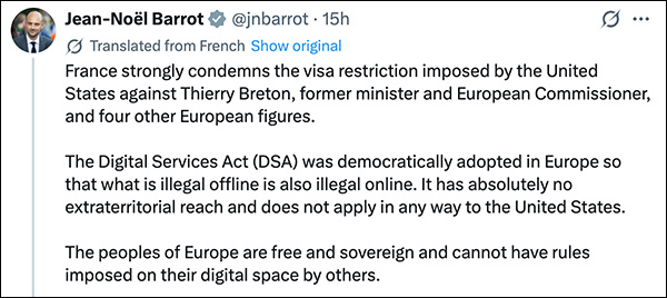 在被制裁的欧盟委员会前委员、法国人蒂埃里·布雷东怒斥美国此举是"麦卡锡式的政治迫害"后,法国总统马克龙、外交部长让-诺埃尔·巴罗12月24日也在社媒平台X上表达了强烈的谴责。