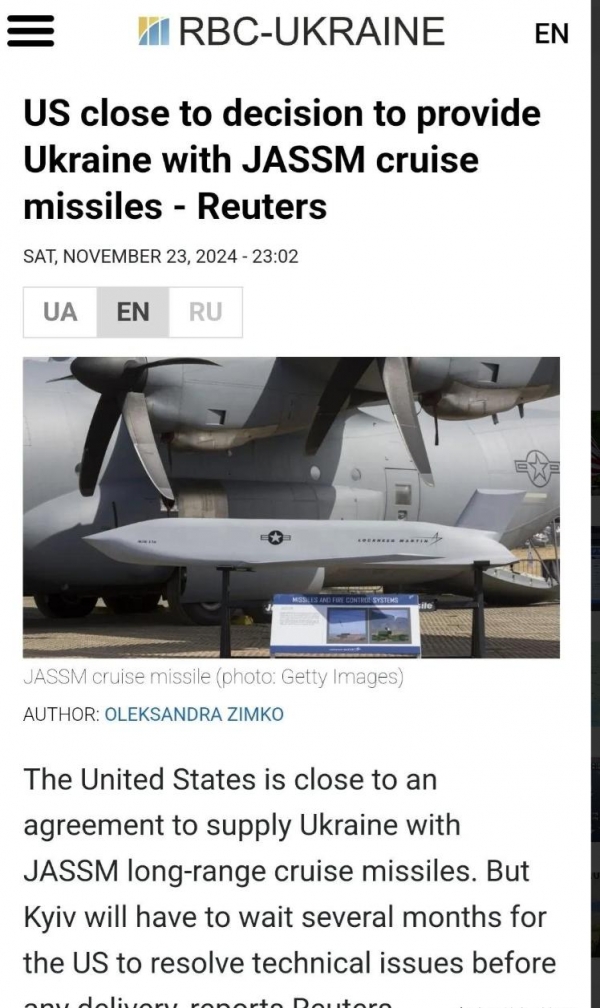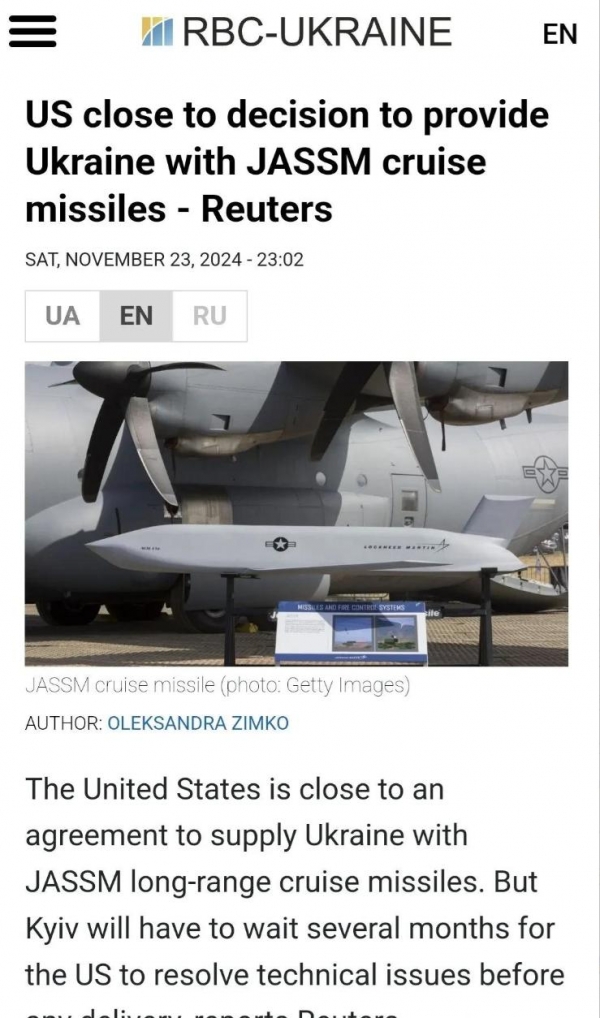11 月 23 日,路透社消息如平地一声雷,多家媒体纷纷转载:美国拜登政府正在紧锣密鼓地筹备向乌克兰援助 JASSM 防区外导弹,并且援助计划已接近最终决策阶段。这一计划一旦实施,无疑将为乌克兰的军事力量注入一针 "强心剂"。乌克兰在接收 F16 战斗机后,若再获得 JASSM 导弹,其作战半径将大幅扩展。