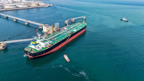 2026年3月31日,山东青岛,山东港口青岛港原油码头作业忙,一艘正在停靠码头的油轮。 IC Photo