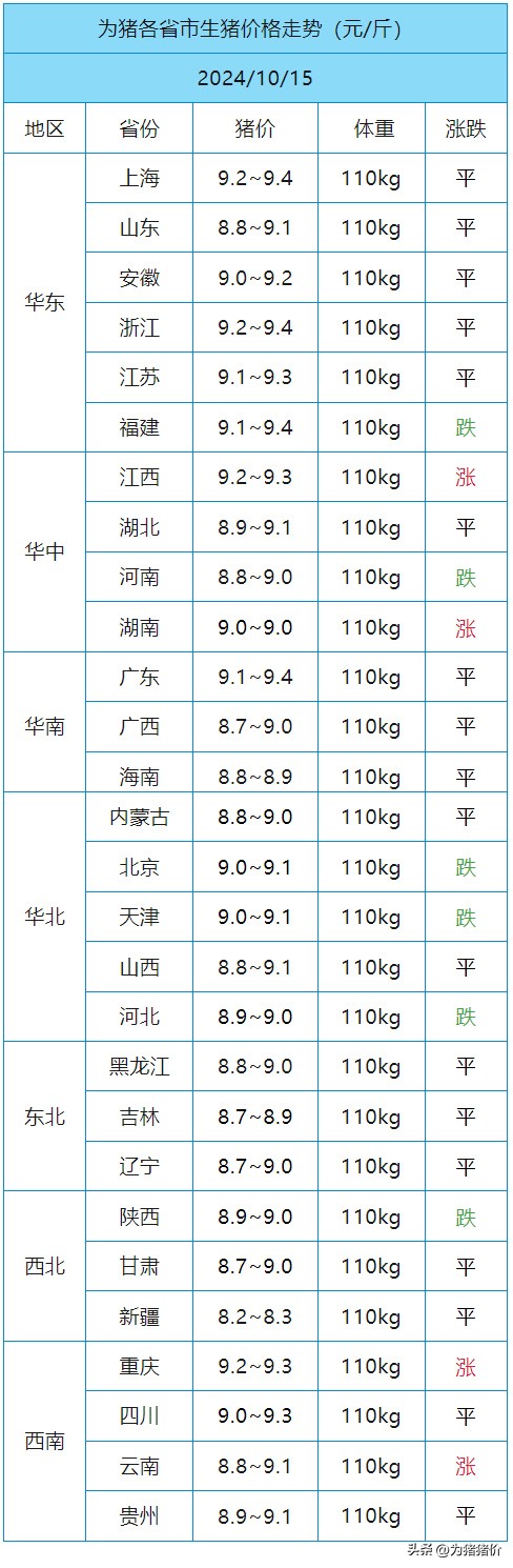期货走弱,二育进场表现一般。终端疲软,屠宰缩量采购,对毛猪产生压力。今日东北地区散户价格小涨,集团猪企回到,标猪报价在8.89-9.5,河北河南山东地区稳中下调,标猪报价在8.9到9.1左右,今日的河南一哥回落2毛,广东地区稳定,今日华储网发布两则通知,将于10月16日轮换收储1.96万吨冻猪肉 ,或对猪价形成一定支撑拉动一波上涨。