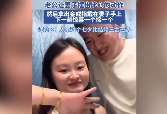 8月10日,山西。据视频显示,老公让妻子摆出比心的动作,然后拿出金戒指戴在妻子手上,妻子刚戴好金戒指老公又拿出了金吊坠项链给妻子戴上,你以为这就没了?老公接着又拿出了金镯子给妻子戴上了,最后老公又拿出了一条金项链给了妻子。