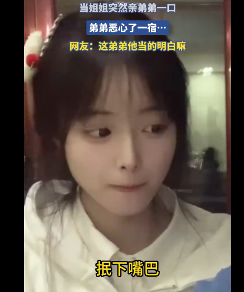 视频中,姐姐想突袭亲弟弟一口,没想到被弟弟预判挡住了,姐姐又试了几次都被挡住了,最后姐姐亲到了弟弟,没想到弟弟恶心了一宿