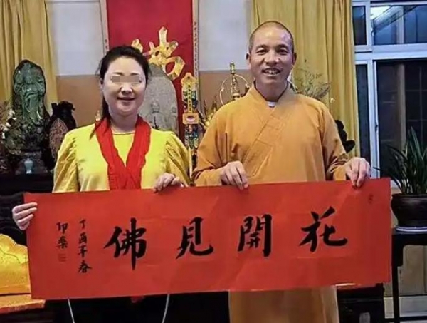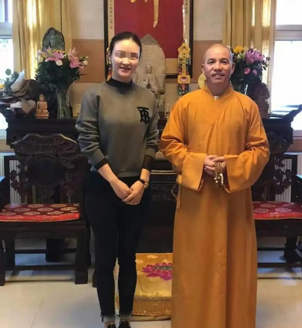 只见合照中,印乐法师和这位女香客皆是正襟危坐、着装得体、落落大方。