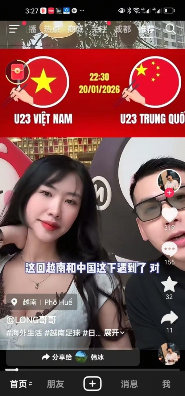 很多在越南找到女朋友的中国男球迷,也拍视频展现在越南街头与当地球迷一起看球的热闹场景,还让越南女朋友预测谁会赢,他的越南女朋友拒绝预测,说是大家开心就好。