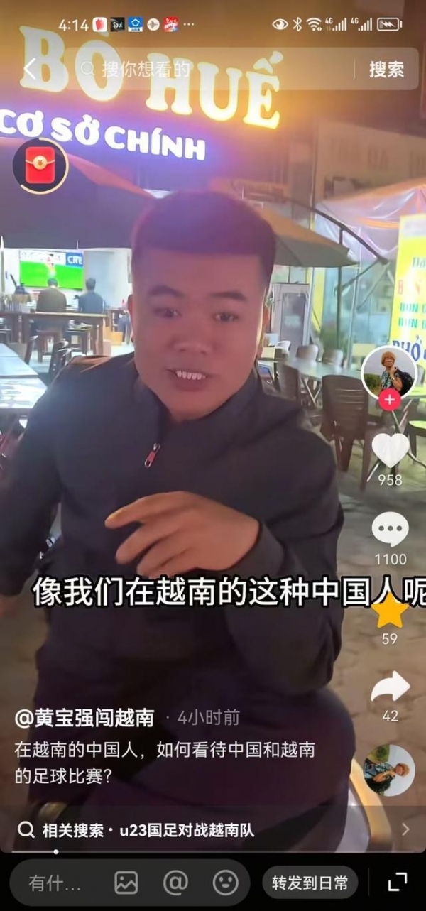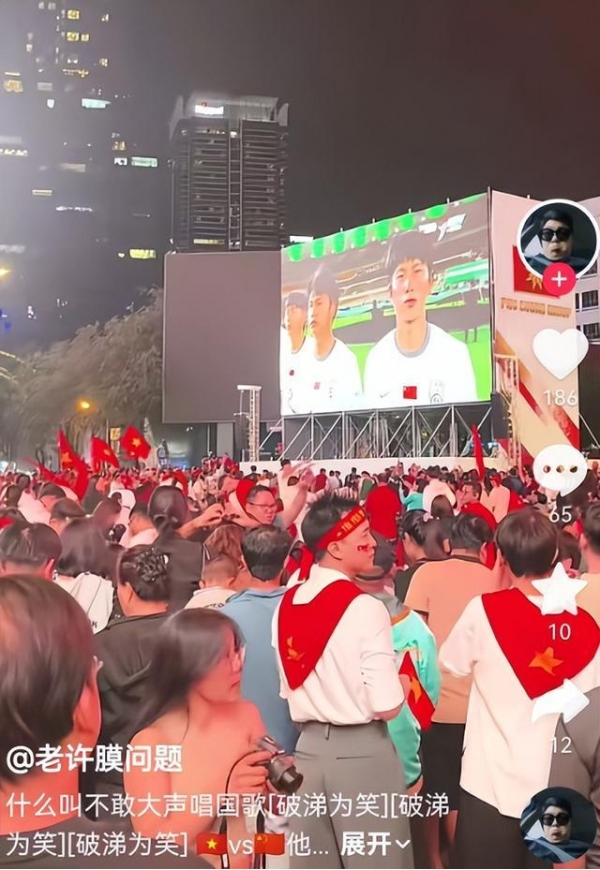 一个叫"黄宝强"的在越中国博主,比赛中调侃地说:"今天晚上可能又是一个丢脸的晚上,像我们这些在越南的中国人呐。现在越南的大街小巷都放着中国男足与越南男足的比赛。虽然现在还是0-0,但是我觉得今天晚上应该是很丢脸的一个晚上。因为越南人赢哪个国家不重要,他们现在就是觉得赢中国是最重要的。如果真让他们赢了,那等一下马路上那种氛围啊,我不敢想象。"