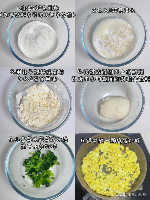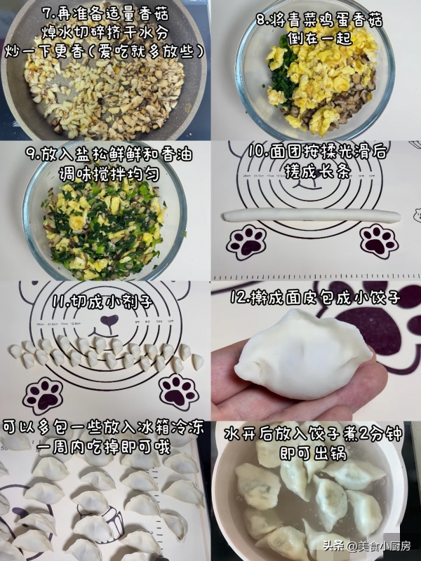 1. 干香菇泡发洗净挤干切小丁,热锅炒香放凉;青菜焯水10秒,过凉水挤干切细末。