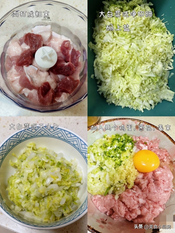 2. 白菜洗净沥干切碎,加少许盐抓匀静置5分钟,挤干多余水分(避免煮后出水)。