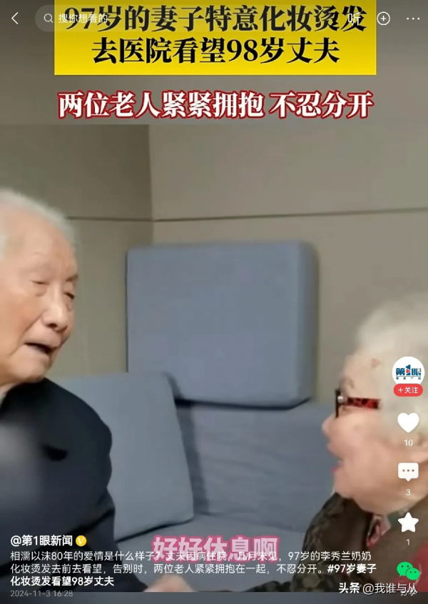今天,孩子们推着老太太到医院来看望老爷子了,老两口见面以后,深情的互相凝视着,叮嘱着对方,久久的不愿意分开。