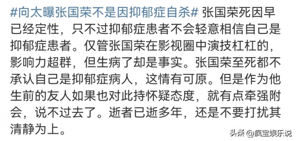 如今很多网友也都表示逝者已逝,清静为上,并且认为抑郁症患者不会轻易相信自己是抑郁症患者,张国荣确实患病。