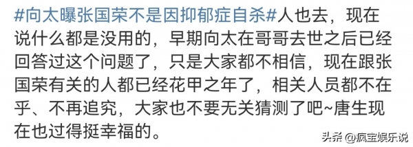 就在昨日,向太陈岚的社交媒体上更新了一个视频,是关于其哥哥张国荣离世的隐情采访,在视频中陈岚袒露自己曾在张国荣离世前一个小时给她通过电话,并且表示还让她召开记者发布会表示他自己并没有得抑郁症,不过就在陈岚忙完手上的工作,中间接了很多电话说张国荣跳楼了一直不信,最后彻底确认消息后很内疚,时隔多年还是想再次提及。