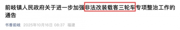 福建前岐镇地区近期对电动三轮车非法载客实行专项整治工作。重点包括全面取缔非法改装的载客三轮车,要求车主对现有的非法改装电池、加装电机三轮车等自行处置,不得驾驶非法改装三轮车上路。对上路查到的,直接报废处理。