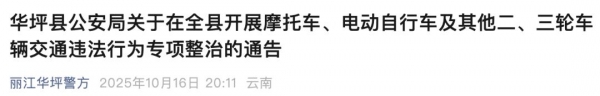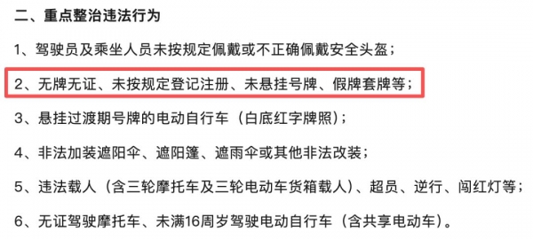 例如,云南丽江华坪县近期在全县开展摩托车、电动自行车及其他二、三轮车辆交通违法行为专项整治,重点整治包括不戴头盔、无牌无证、未按规定登记注册、未悬挂号牌、假牌套牌等、悬挂过渡期号牌的电动自行车