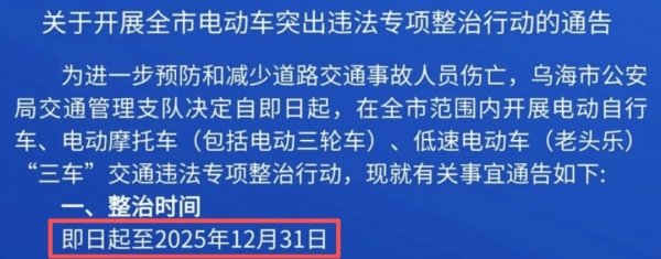 近期乌海市发布通告,将从即日起至12月31日开展电动车突出违法专项整治行动。整治重点就包括了电动三轮车、低速四轮车,特别是用于载客或载货的三轮、四轮车电动车包括老年代步车。严查严罚"三车"闯红灯、逆行、不按规定车道行驶、违法载人等突出交通违法行为。