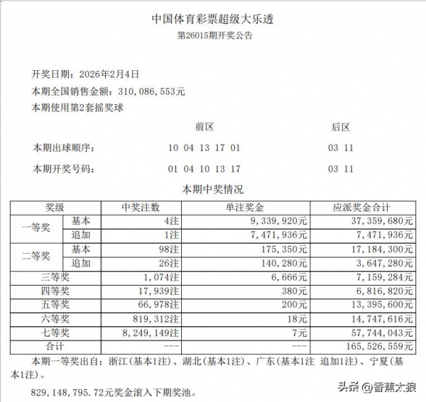大家好!今天是2月4日,星期三,大乐透26015期开奖号码公布了,本期大乐透开出的号码为前区:1、4、10、13、17后区:3、11。前区开出了1组连号,0组同尾号和1枚重号。