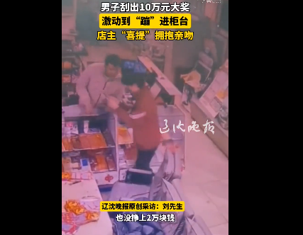 1月27日,辽宁沈阳。男子刮出10万元大奖,激动到"蹦"进柜台,店主"喜提"拥抱亲吻。