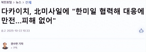 危机发生后,日本第一时间启动与美国和韩国的情报共享机制,高市早苗在记者会上强调"与美方保持密切协作"。这说明她在安全事务上的首选依旧是美国,延续了前几届政府的防务依赖模式。而这种依赖,在朝鲜看来,无异于"借刀杀人"。