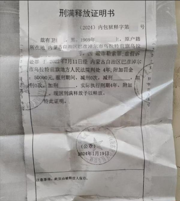 就这么一个小失误,可不得了啦!原本卫某某应该要到 2025 年 1 月 19 日才能被释放,结果因为这写错的日期,他在 2024 年 1 月 19 日就大摇大摆地出狱啦。这提前一年出狱,要是换做别人,估计都偷着乐了,赶紧跑得远远的。但卫某某倒也没闹出啥大动静,出狱后就在乌拉特前旗打工,过着普普通通的日子。