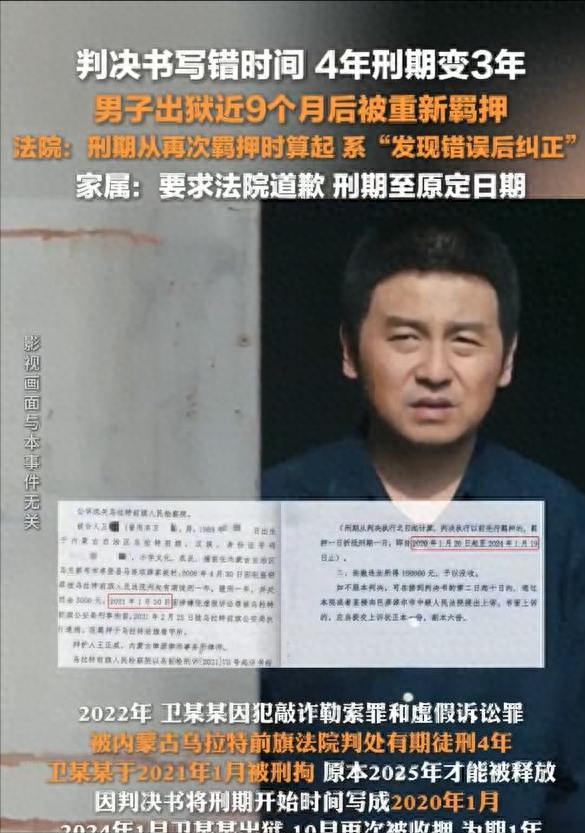 2022 年,卫某某因为犯了敲诈勒索罪和虚假诉讼罪,被内蒙古乌拉特前旗法院判处了有期徒刑 4 年。这本来没啥特别的,犯了错就得接受惩罚嘛。可谁能想到,这后面的剧情简直比电视剧还精彩!卫某某是 2021 年 1 月被刑拘的,正常来说刑期应该从这个时候开始算,结果呢,那判决书上竟然把他的刑期开始时间写成了 2020 年 1 月。