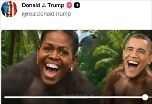 当地时间2月5日,特朗普在其"真实社交"账号上发布了一段涉及美国前总统奥巴马夫妇的视频片段,画面显示两人的头像被剪辑到了灵长类动物身上。此举随即招致各界强烈谴责,尽管白宫已于次日(6日)删除该视频,但舆论风波仍在持续发酵。白宫一名高级官员6日中午对媒体说,此帖为白宫一名雇员"误发"、已被删除。