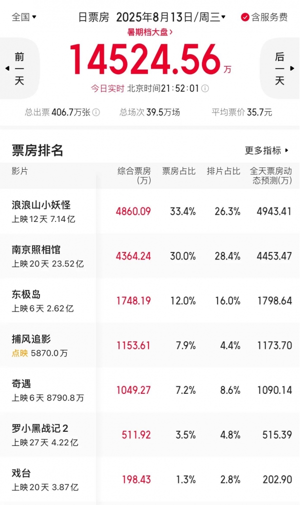 截至目前,暑期档票房表现最好的《南京照相馆》拿下了23.52亿的票房,《浪浪山的小妖怪》票房7.14亿,《长安的荔枝》票房6.67亿,这是暑期档排名前三的作品。