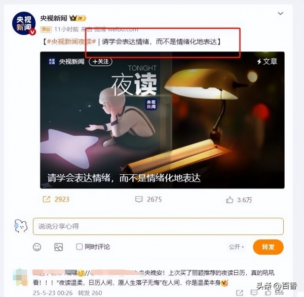 5月23日《人民日报》官微发的"学会表达情绪,而非情绪化表达"虽未点名,但热评第一的"赵姐速来学习"点赞数半小时破百万。