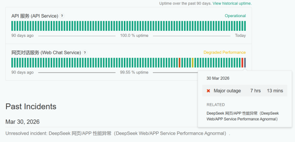3月30日,#DeepSeek崩了#登上微博热搜。DeepSeek官方服务状态网站显示,DeepSeek网页、App服务出现重大中断。