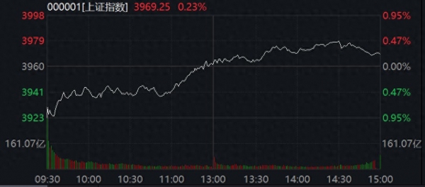 截至收盘,上证指数涨0.23%,报3969.25点;深证成指涨0.37%,报13223.56点;创业板指涨1.03%,报3166.23点。