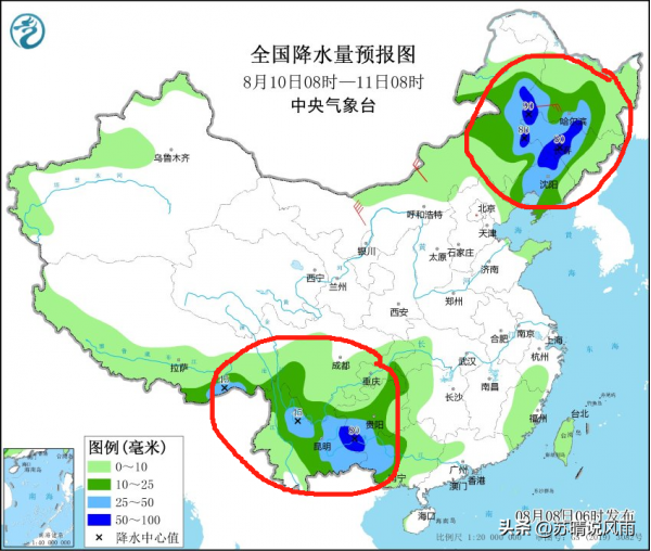 暴雨地区(50~90毫米):内蒙古的东部、黑龙江的南部、吉林的中部、辽宁的北部、黔西南部等地的部分地区。