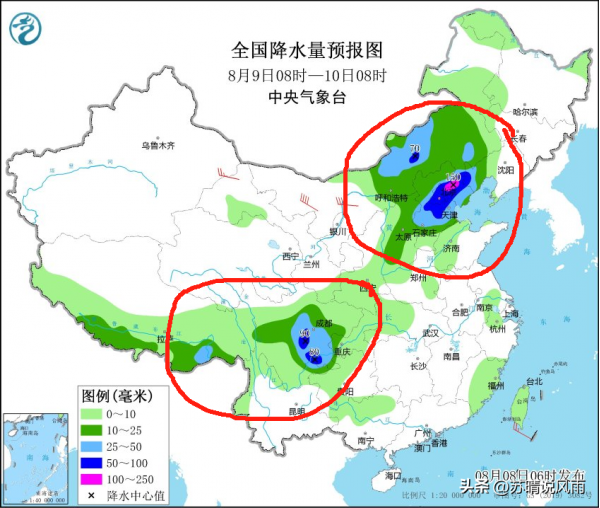 暴雨大暴雨地区(100~150毫米):内蒙古的中部、辽宁的西部、冀中和冀北还有京津、四川中部、重庆南部等地的部分地区。