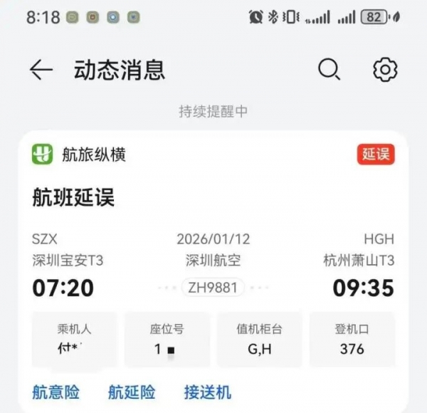 刚刚,@深圳航空通报称:1月12日,深圳航空ZH9881航班(深圳-杭州)飞机在地面滑出时发生故障。机组按程序滑回排故,期间深航现场做好服务保障。目前航班已于11:20从深圳宝安国际机场顺利起飞,预计12:50抵达杭州萧山国际机场。深航始终将旅客的安全放在首位,对于此次航班延误给旅客出行带来的不便,深圳航空深表歉意,感谢大家的理解与支持。