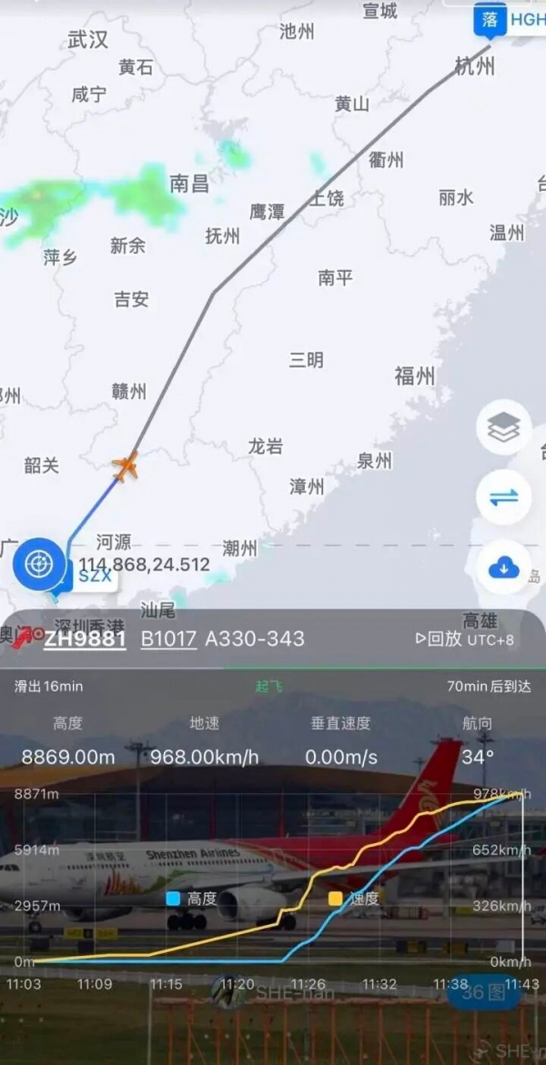 记者查看飞行软件显示,早上6:21,ZH9881航班开始上客,9:07发生不正常原因。11:20该航班已经起飞。