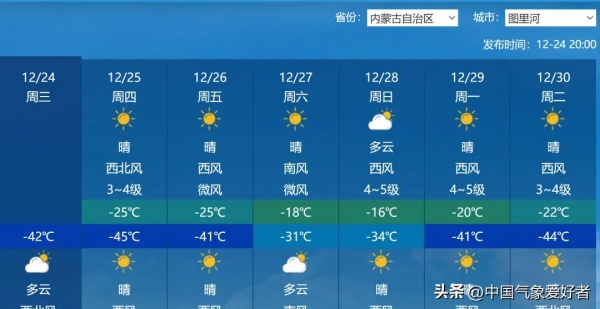 不过正如我们之前节目所说,北极涡旋即将亲临东北,极寒天气已经抵达大兴安岭地区。12月24日早晨,图里河跌破-41度。而接下来,12月25-26日早晨,图里河有可能跌破-45度,大兴安岭地区最低可逼近-50度,哈尔滨、长春逼近-30度。