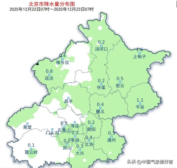 而12月23日凌晨,京津冀悄无声息的降下了12月的第二场雪,和东北不一样,这场雪非常温柔,匆匆离去,北京降雪量0.4毫米、天津0.3毫米,很多朋友都没有留意到凌晨有雪花飘落。 和这场雪相伴的,是深度北上的强盛暖空气。