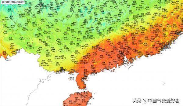 在12月下旬的东北,这场暖空气让沈阳下起了边下边化的零上雪,让辽宁南部很多地方下起各种东西,其强度堪称离谱。而在海南、广西东南部、广东、福建中南部,暖空气的强盛更是让人感觉夏天回来了。12月24日,广州达26.7度、番禺27.6度,广西岑溪25.9度,福建华安和大田25.4度,下午出门真的可以穿短袖,晚上睡觉肯定也要防蚊子。