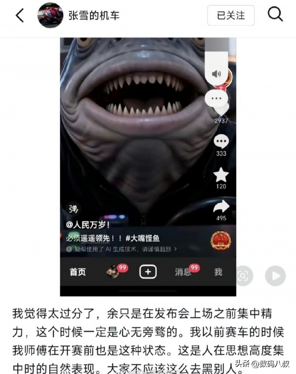 4月25日深夜,张雪直接公开发文,硬核力挺余承东,字字铿锵:"我觉得太过分了!余只是在发布会上场之前集中精力,这个时候一定是心无旁骛的! 我以前赛车的时候,我师傅在开赛前也是这种状态,这是人在思想高度集中时的自然表现,大家不应该这么去黑别人!"