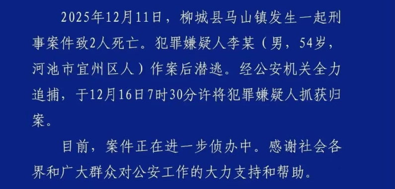 2025年12月16日清晨,广西柳州市柳城县公安局的一则通报让持续五日的紧张追逃画上句号--造成两名妇女死亡的犯罪嫌疑人李某,于当日7时30分许被成功抓获归案。这场牵动人心的缉凶行动,以警方10万元重金悬赏为线索,最终在群众协助下锁定山林藏匿点,将潜逃的凶手绳之以法。