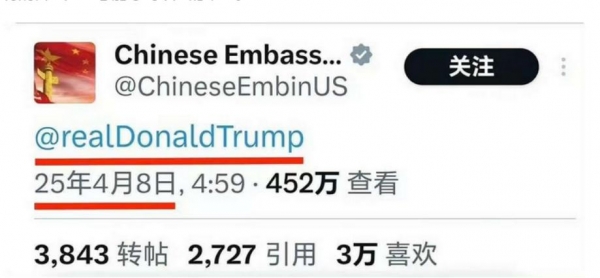 讽刺的是,看到自己施压中国的手段没有效果后,特朗普又开始进行"精神胜利法",声称中方也非常想与美国达成协议,但苦于不知道怎么开始,他正在等待中国打来的电话,这个情况一定会发生。特朗普的言论,或许还能欺骗他的支持者,但在中方的眼中,这就是美国"已经没有招数"的体现。就在4月8日当天,中国驻美大使馆就在社媒直接@特朗普,但什么都没有说,这其实就是提醒美国政府期限已经到了,为何50%的加税没有落实?中方的举动,可以说是对特朗普政府的贴脸嘲讽。
