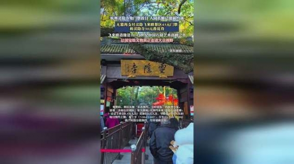 此前的11月19日,杭州西湖风景名胜区灵隐管理处发布公告称,经研究决定,灵隐飞来峰景区(含灵隐寺、永福寺、韬光寺)自2025年12月1日起实行免票政策。